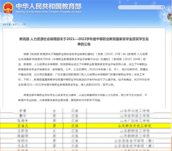 山东新东方技工学校饭店(酒店)服务专业王同学,获得2022年度国家奖学金6000元。